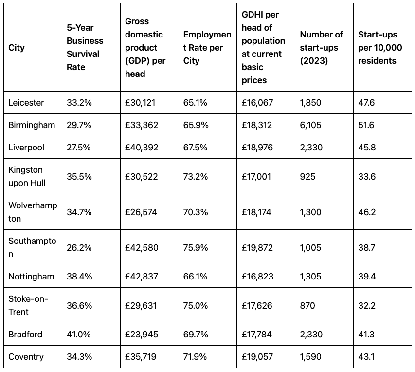 The study also reveals the UK cities where entrepreneurs face the toughest environment for building a business. Leicester ranks as the most challenging location overall, recording the lowest disposable income (£16,067), one of the lowest employment rates (65.1%) and a five-year survival rate of 33.2%.