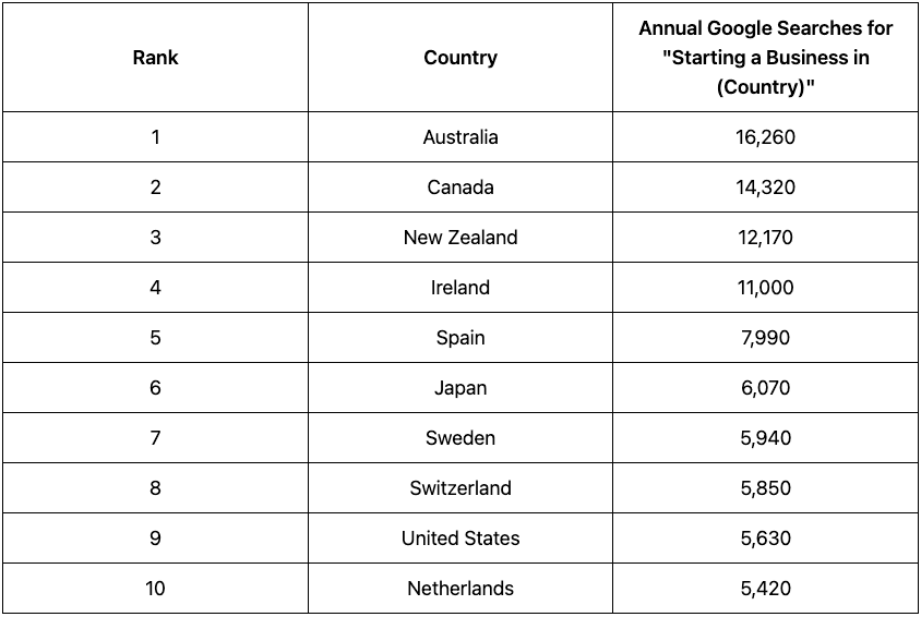 Australia, Canada, and New Zealand attract the highest levels of interest from businesses looking to expand internationally. Australia leads with more than 16,000 annual searches for starting a business, followed by Canada (14,320) and New Zealand (12,170) – all significantly above the global average of 3,594.