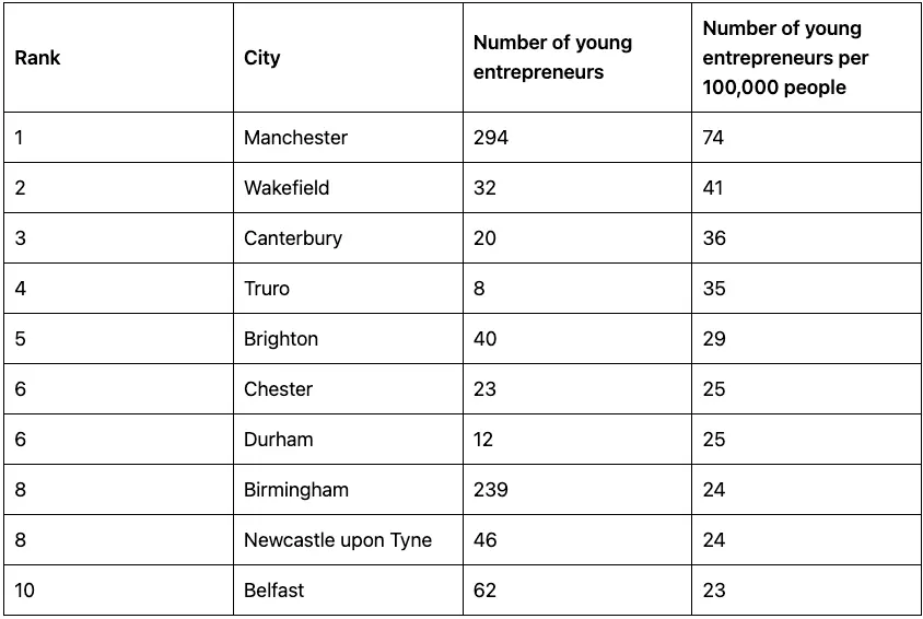 Manchester takes the top spot as the UK city with the highest concentration of young entrepreneurs. The research found around 290 founders aged 24 or under, equivalent to 74 per 100,000 residents.